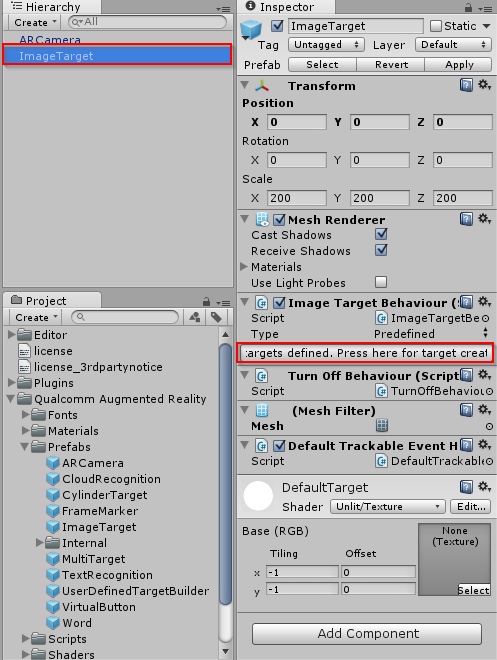 Klik object ImageTarget pada window scene dan pada inspector klik 'press here for target....'